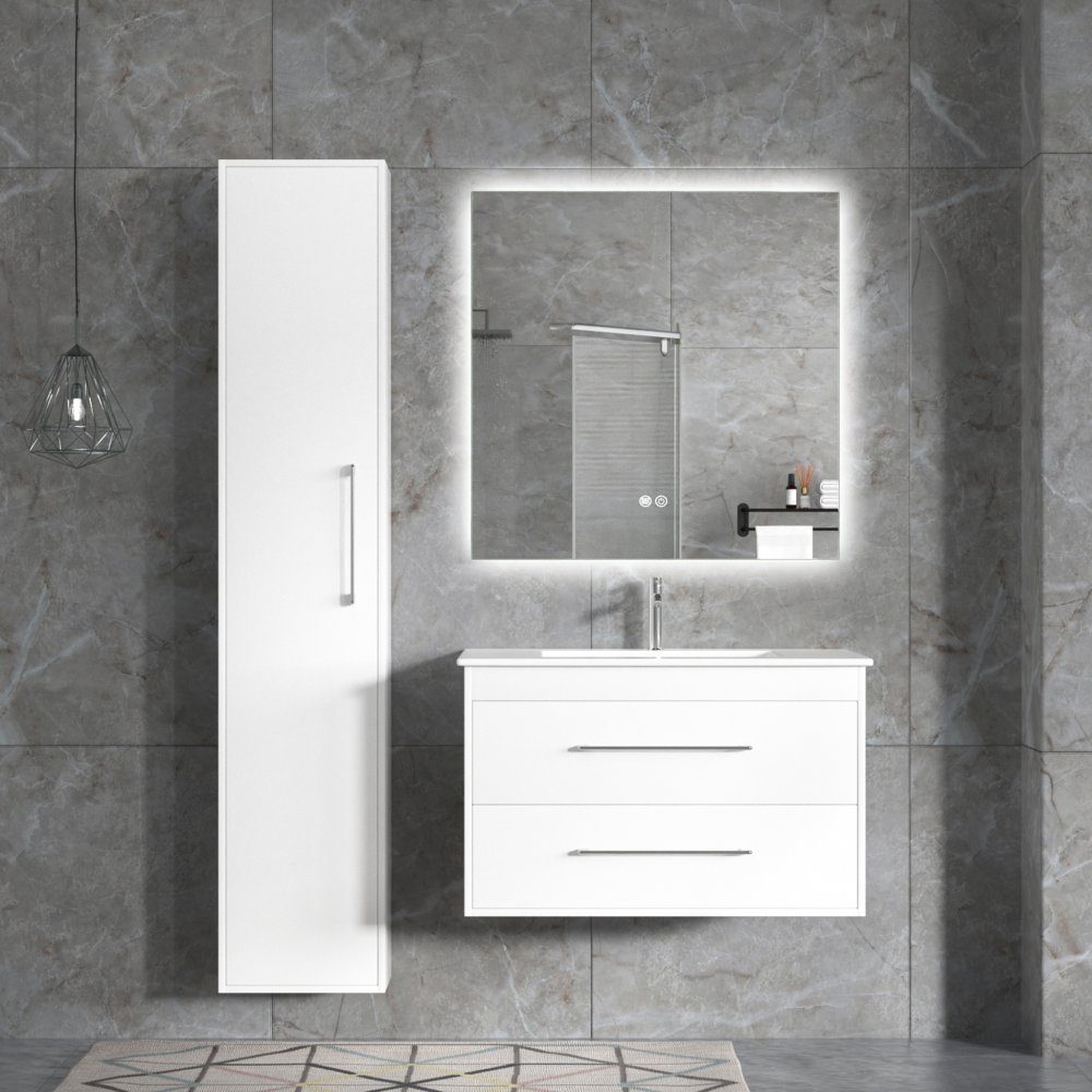 Piristä kylpyhuonetta uudella huonekalulla! Tässä huonekalusarjassa on tyylikäs ja minimalistinen ilme valkoisen sävynsä ansiosta ja ilman ulkonevia kahvoja. Kauppaan kuuluu lipasto kahdella pehmeästi sulkeutuvalla laatikolla, korkea sivukaappi, jossa on useita hyllyjä, pesuallashana, keraaminen pesuallas alareunalla ja iso luksuspeili, jossa on sisäänrakennettu LED-valaistus, himmennin ja huurtumisenestotoiminto. Sekoitin ja pohjaventtiili ovat mustia sopimaan mustaan kahvaan, mikä antaa tyylikkään yleisilmeen.