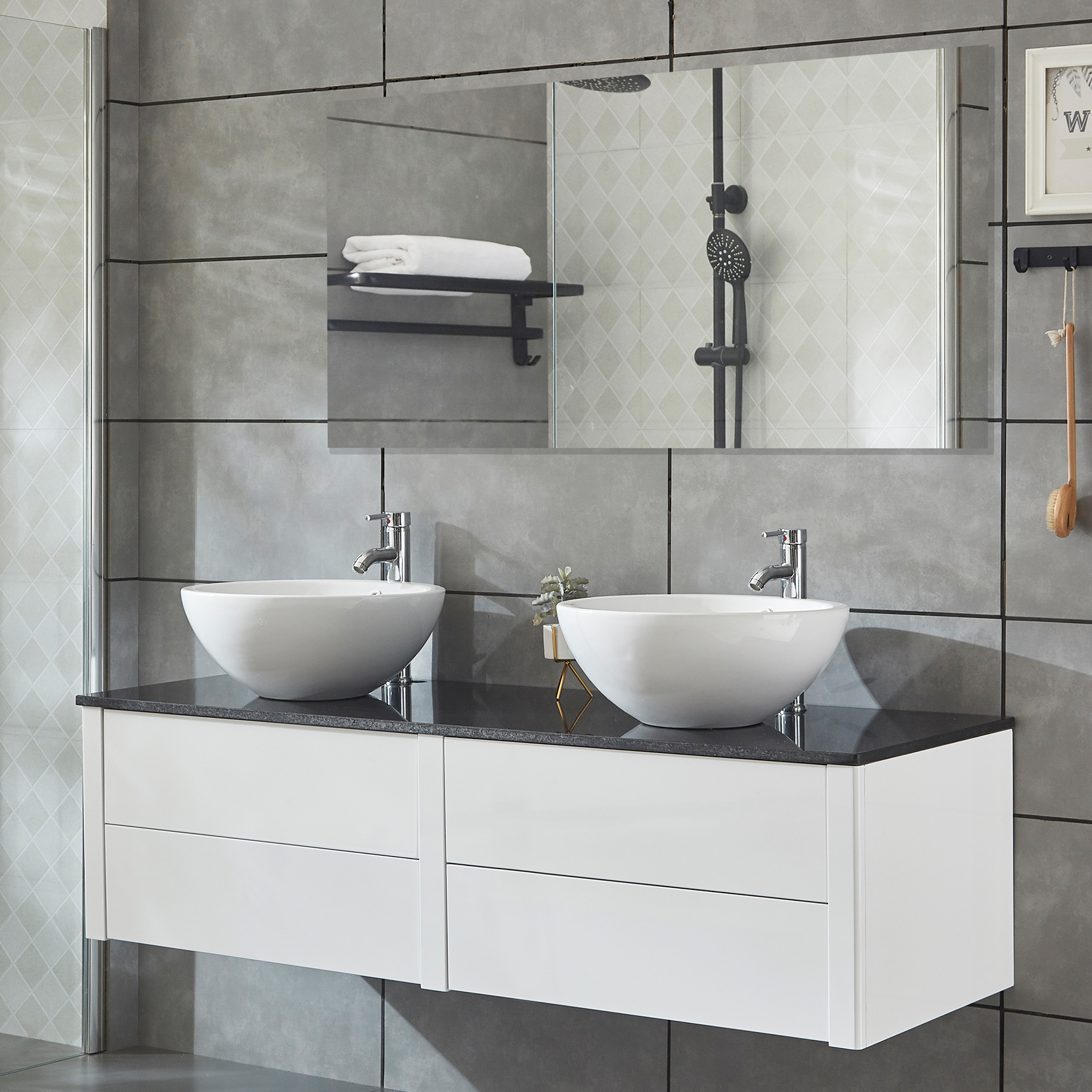 Kylpyhuoneen kalustepaketti, jossa pesuallaskaappi, kaksoisallas ja kylpyhuonepeili tyylikäs muotoilu, joka toimii hyvin valtaosassa kylpyhuoneista. Lipastossa on kaksi erillistä, pyöreää keraamista pesukulhoa, joiden halkaisija on 42 cm ja korkeus 15 cm. Kaapissa on musta kivi (kvartsi) työtaso ja 4 tilavaa, pehmeästi suljettavaa laatikkoa, joissa on sileät korkeakiiltovalkoiset laatikostot ilman kahvoja. Laatikot avautuvat "push-open"-toiminnolla ja ovat täysin ulos vedettäviä, joten saat kylpyhuonekalusteet helposti käsiksi ja kätevästi säilytystilaan kylpyhuoneessasi.