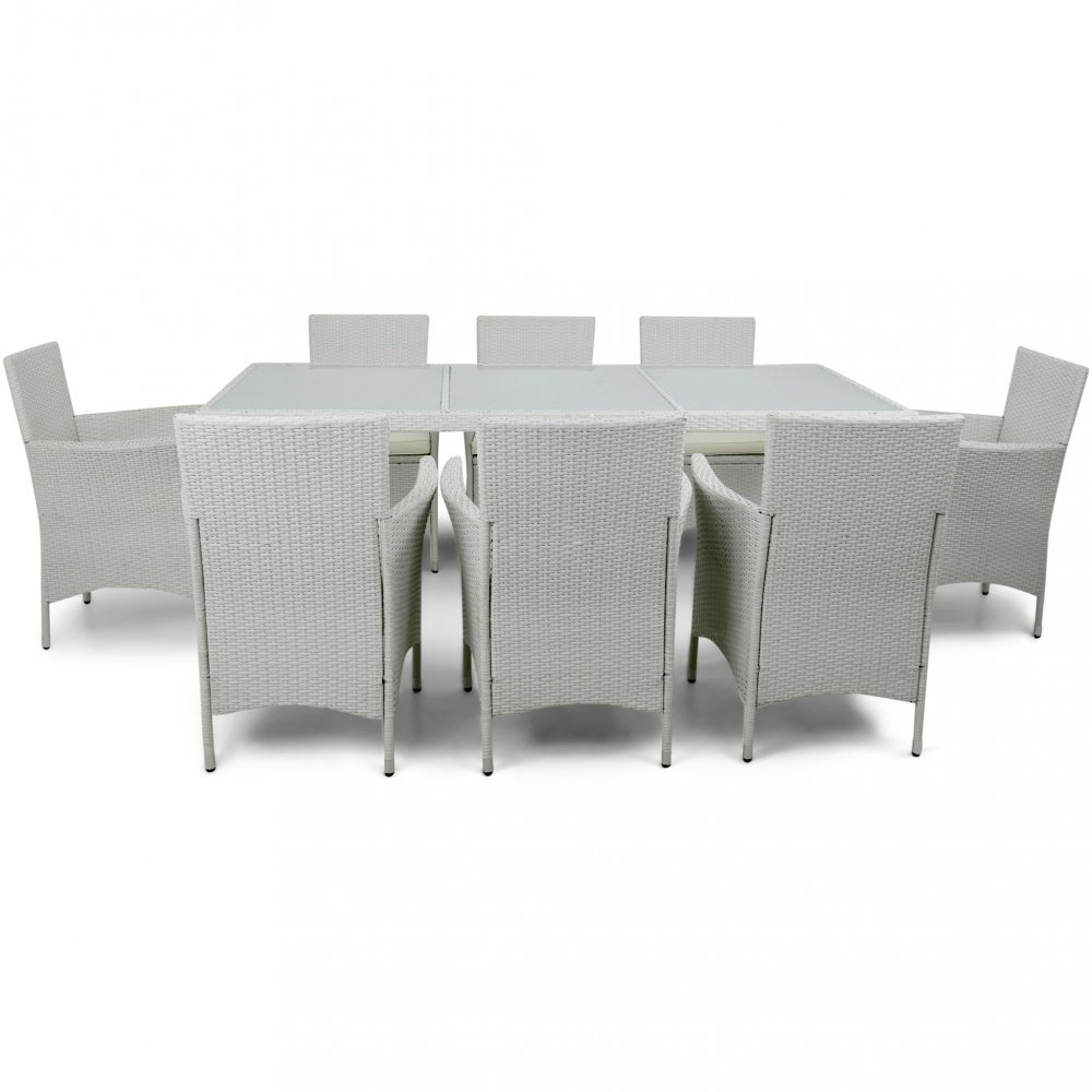 Tyylikkäät ruokailuryhmäulkokalusteet laadukkaasta valkoisesta keinorottinkista. Mukana suuri pöytä ja 8 tuolia. Pöytä on 190 cm pitkä ja siinä on 5 mm paksu valkoinen lasilevy, joka on jaettu 3 osaan. Rottinki on käsin kudottu tiheästä valkoisesta kankaasta. Pyynyt sisältyvät tähän ruokaryhmään.
